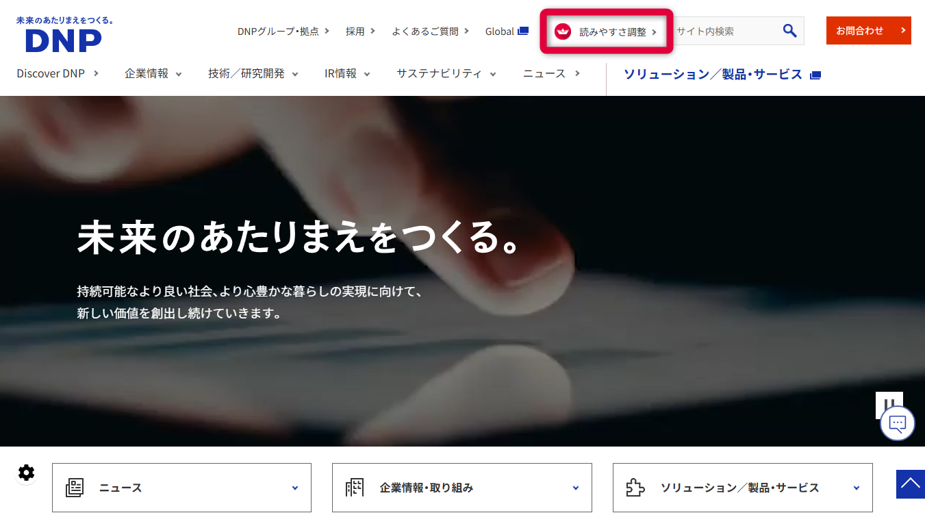 大日本印刷株式会社(DNP)のWebサイト トップページの「読みやすさ調整」で、「じぶんフォント」を選択可能に